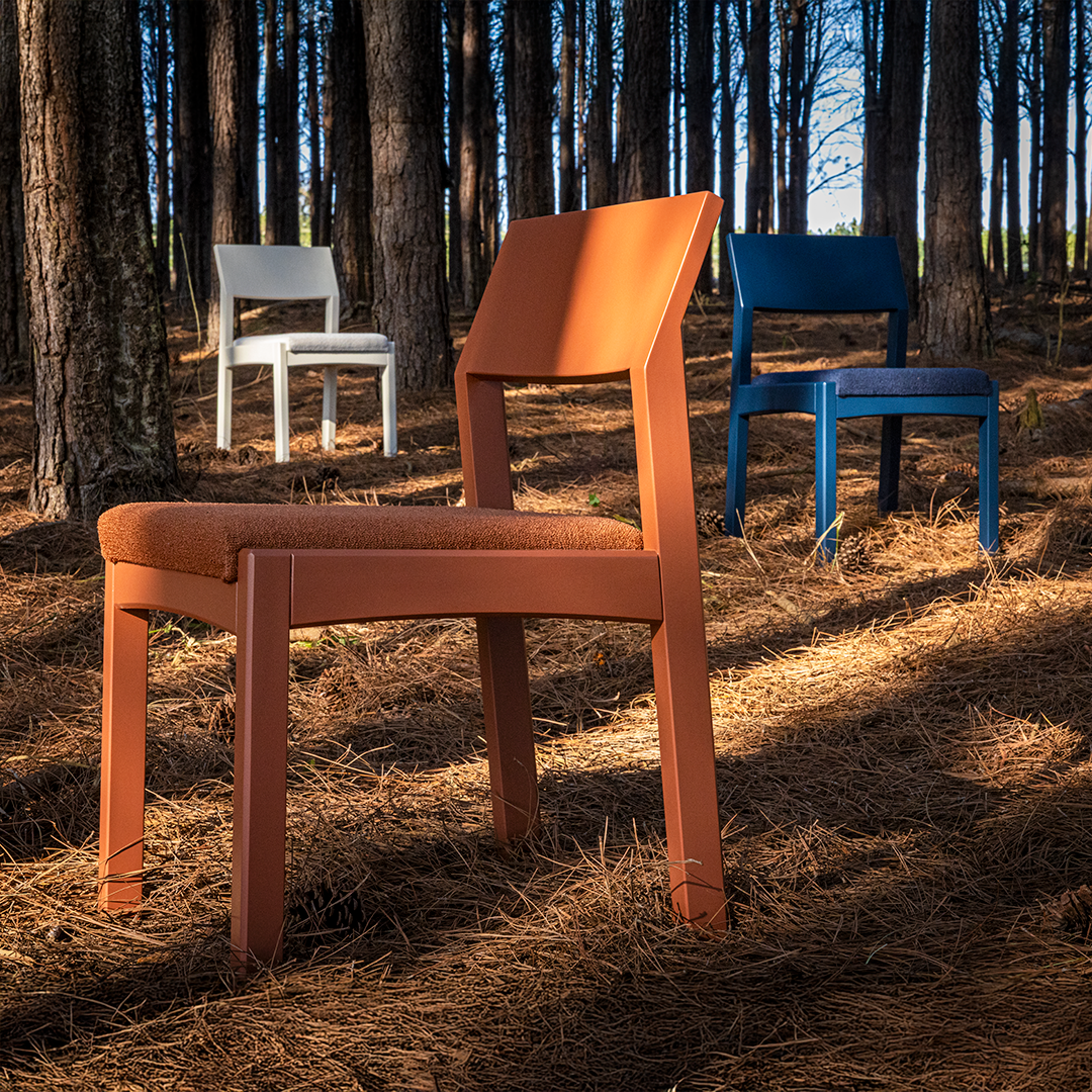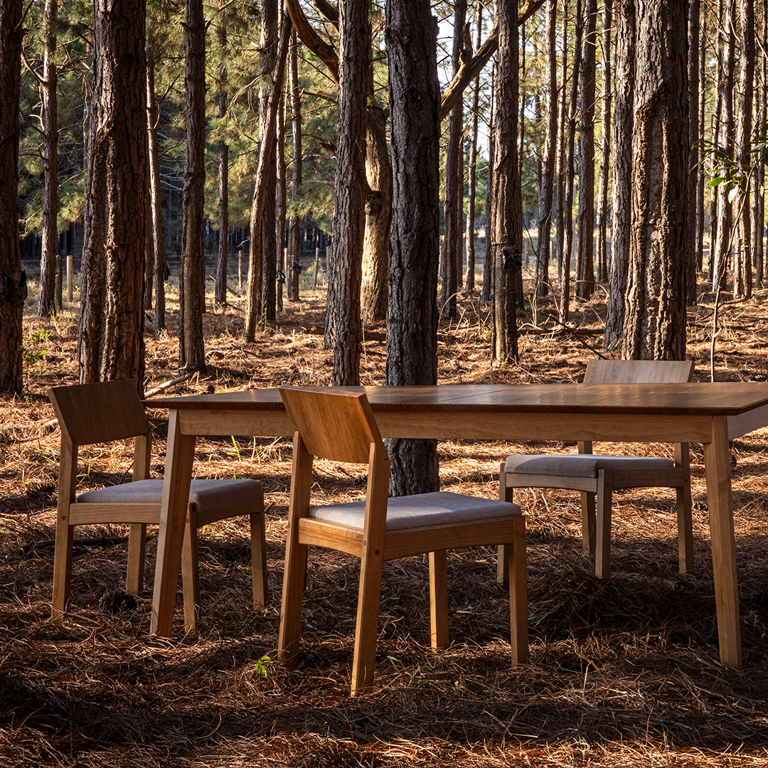 Com linhas geométricas que equilibram retas, ângulos e arcos, as peças oferecem conforto e uma estética perene. Inspirada na marcenaria tradicional, a coleção valoriza os encaixes que revelam a força e a beleza da madeira.