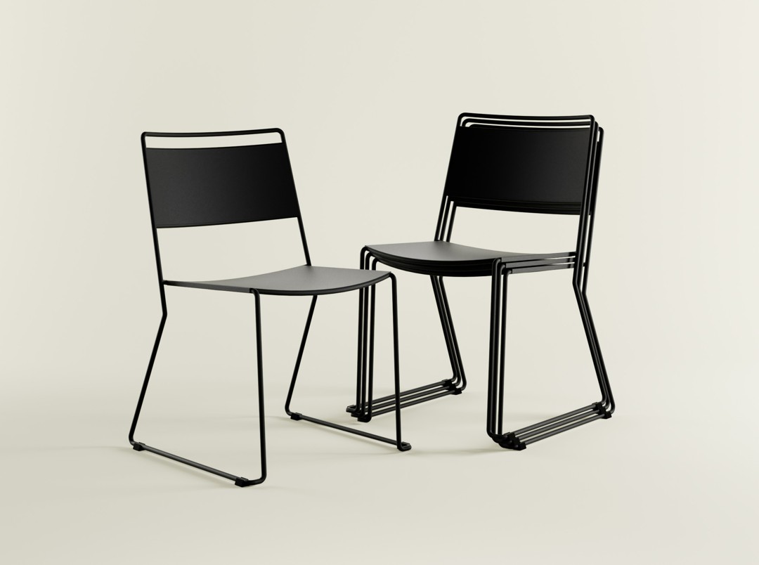 Cadeira para área interna e varanda coberta, indicada para ambientes de convívio residenciais e corporativos. Possui estrutura em barras redondas e chapas de aço carbono com tratamento anticorrosão e pintura eletrostática microtexturizada. O assento e o encosto em chapas retas, com vão entre as superfícies, reforçam a leveza visual e favorecem o conforto. Empilhável, conta com sapatas e ferragens adequadas para o empilhamento e é entregue montada, facilitando o uso em espaços de alta rotatividade.
