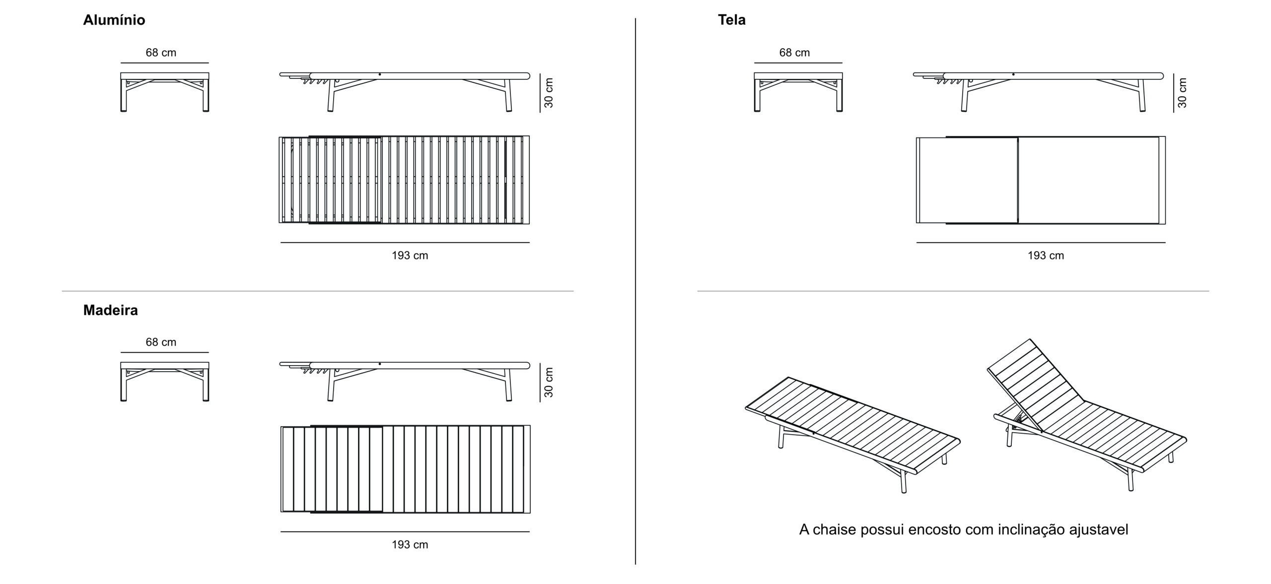 Espreguiçadeira estilo Chaise desenhada para uso em áreas externas. Sua estrutura é de alumínio com pintura eletrostática poliéster, resistente a intempéries. O assento pode ser em alumínio, sendo o produto inteiro soldado em uma peça só, ou em madeira maciça cumaru ripada com acabamento acetinado.