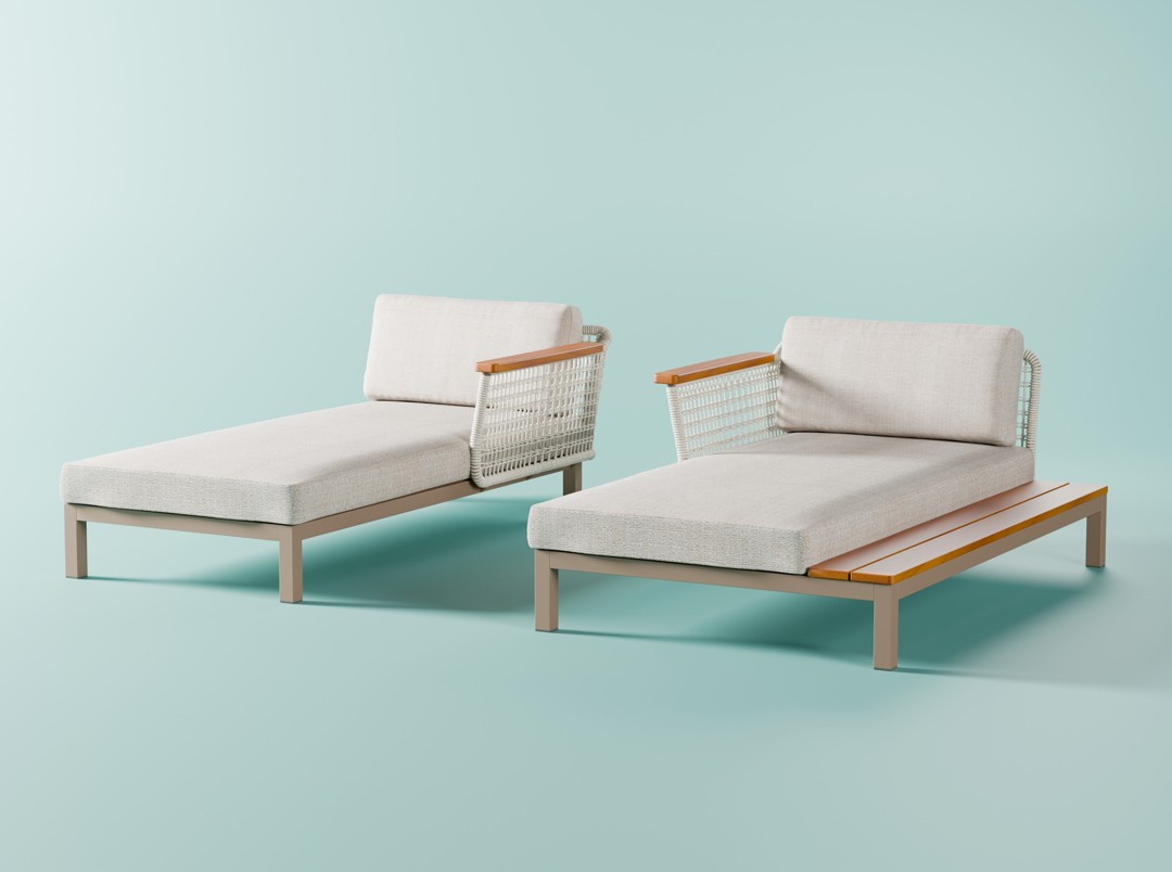 A Chaise Ponte foi criada para áreas externas, unindo a resistência da estrutura em alumínio ao conforto dos estofados ergonômicos. O encosto é envolto por trançado artesanal em macramê de corda náutica, combinado a detalhes em madeira maciça, que reforçam a identidade brasileira da peça.