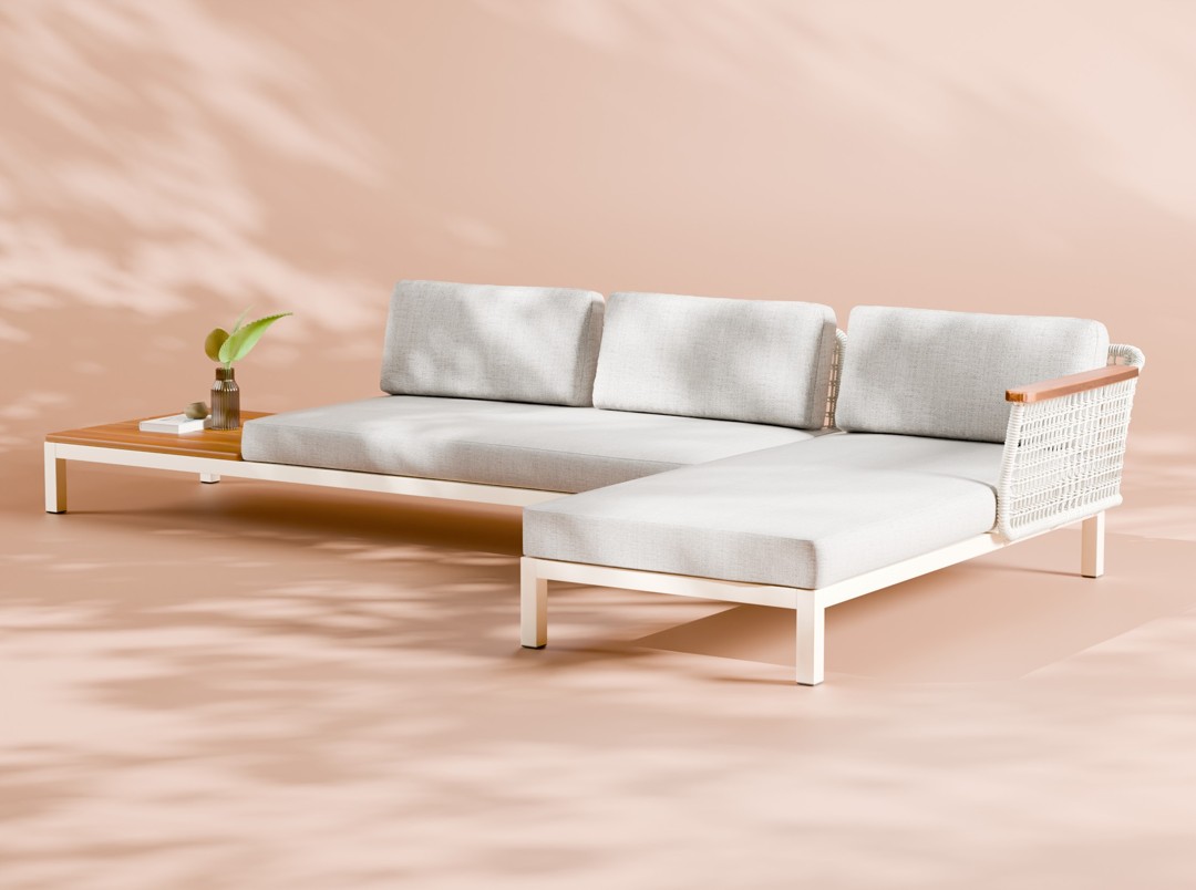 Linha de estofados para áreas externas com trançado de macramê com padronagem exclusiva. Disponível em três módulos sendo um módulo central, um módulo canto, com braço disponível à direita ou esquerda e um módulo chaise. A linha combina a expertise técnica da produção industrial com a finalização artesanal do trançado macramê de corda naval.