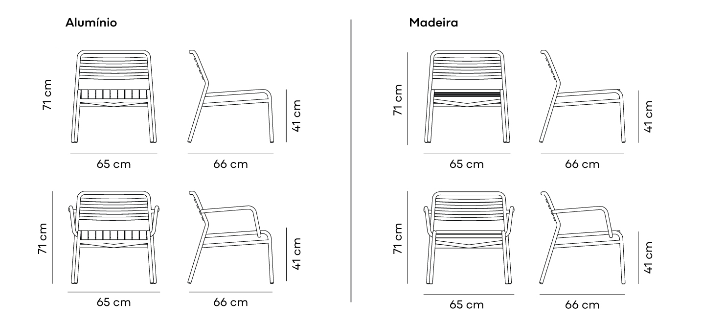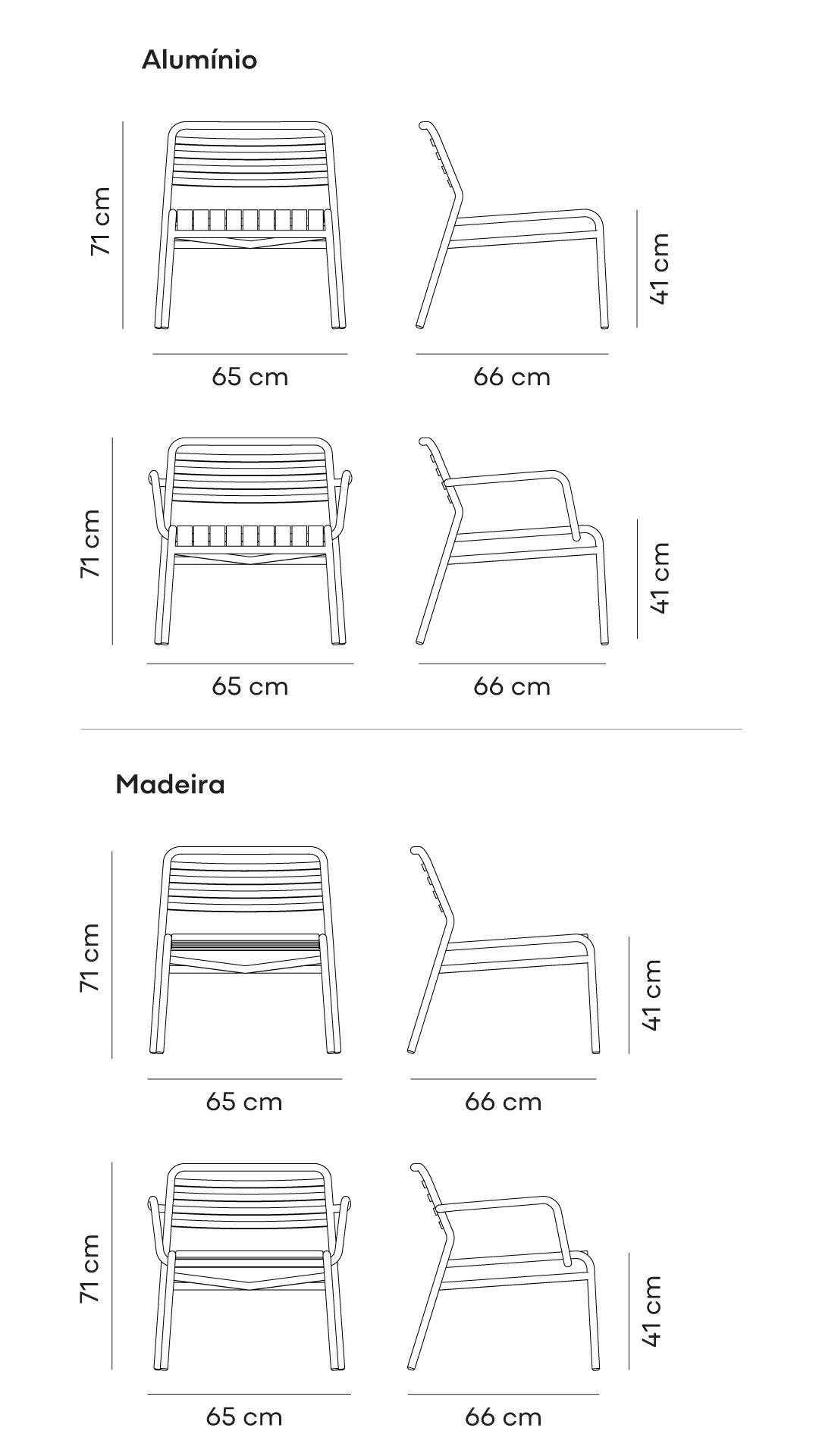 Poltrona para área externa com ou sem braço. Produto pensado para momentos de descanso ao ar livre em um momento de pausa do trabalho ou das atividades escolares do dia a dia. Sua estrutura é de alumínio com pintura eletrostática poliéster. Na versão com assento de alumínio, o produto é inteiro soldado em uma peça só. A versão da cadeira com assento em madeira maciça ripada é feita com cumaru com acabamento acetinado.
