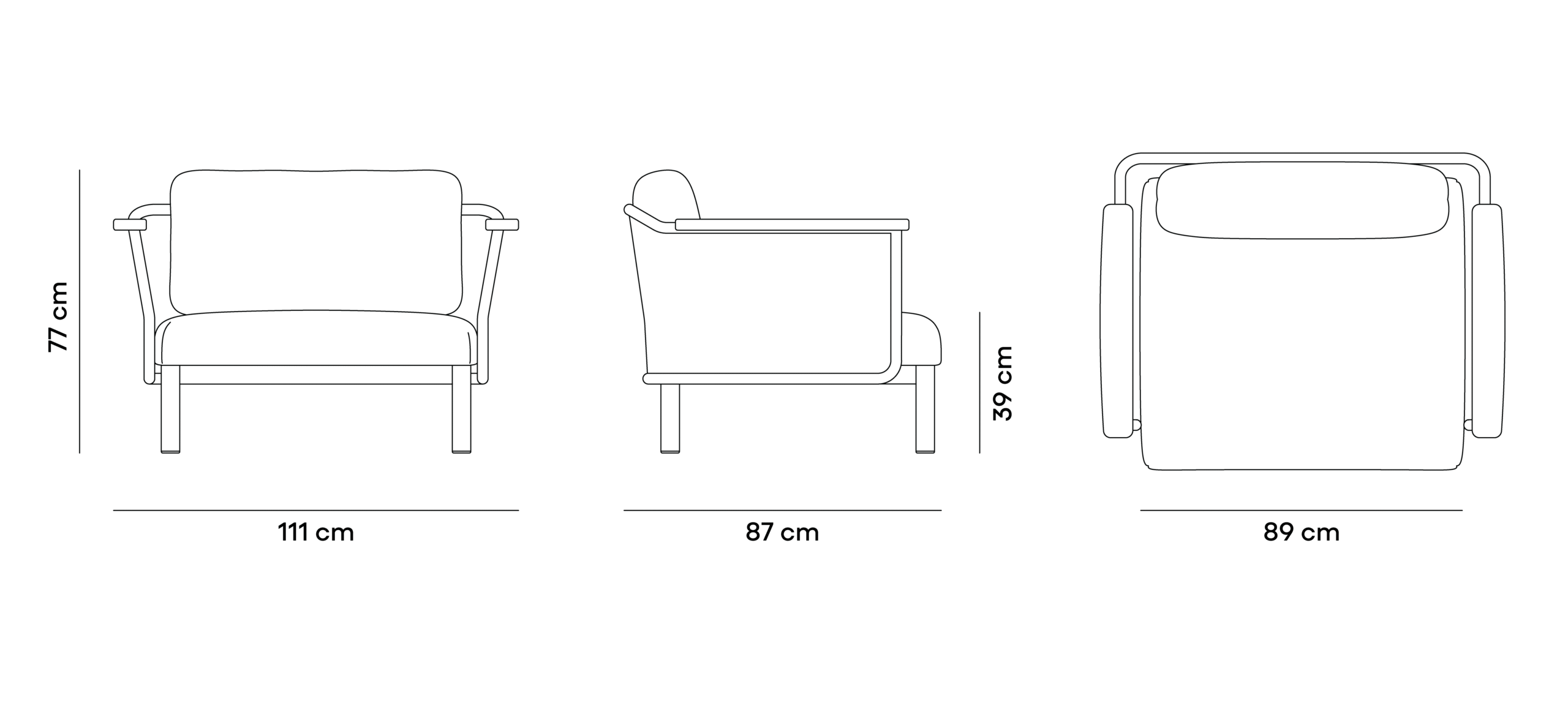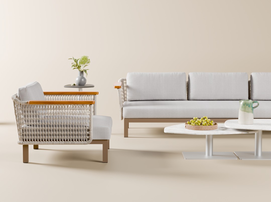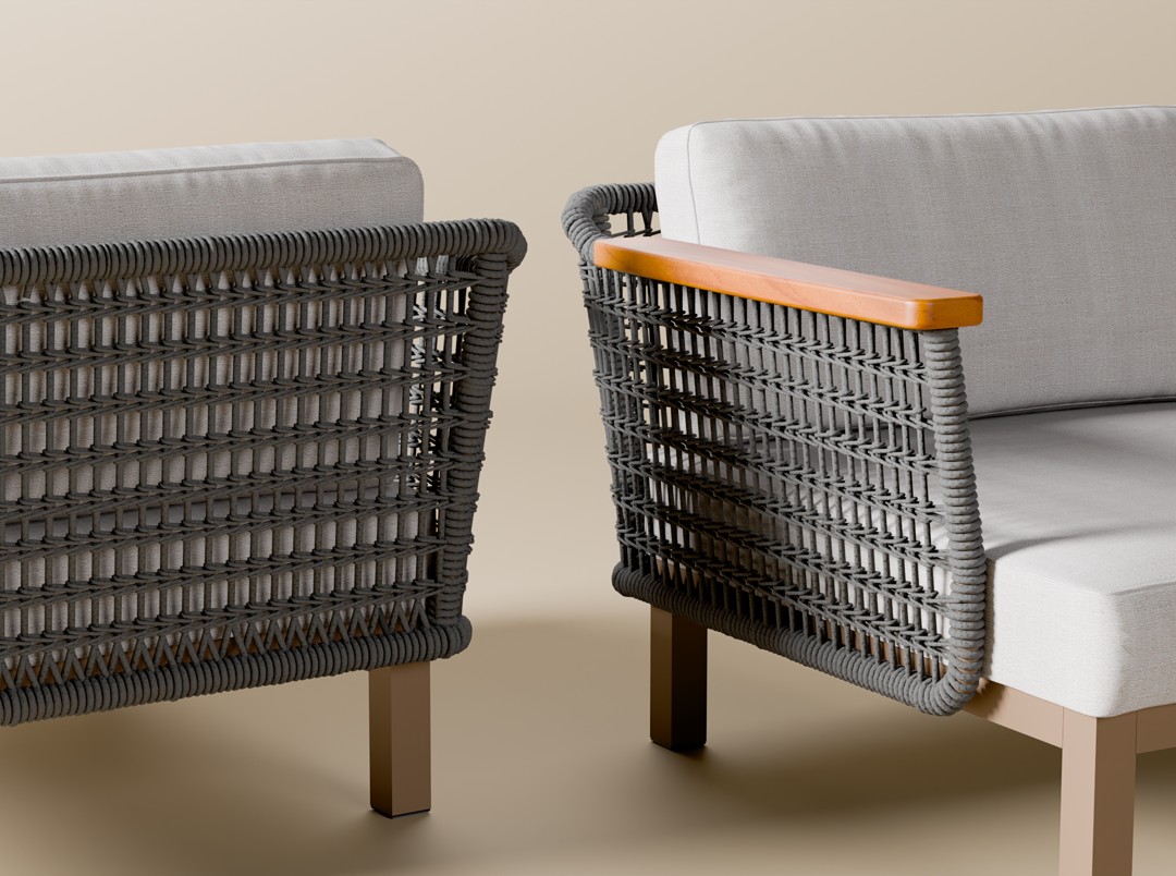 Linha de estofados para áreas externas com trançado de macramê com padronagem exclusiva. Disponível em três módulos sendo um módulo central, um módulo canto, com braço disponível à direita ou esquerda e um módulo chaise. A linha combina a expertise técnica da produção industrial com a finalização artesanal do trançado macramê de corda naval.