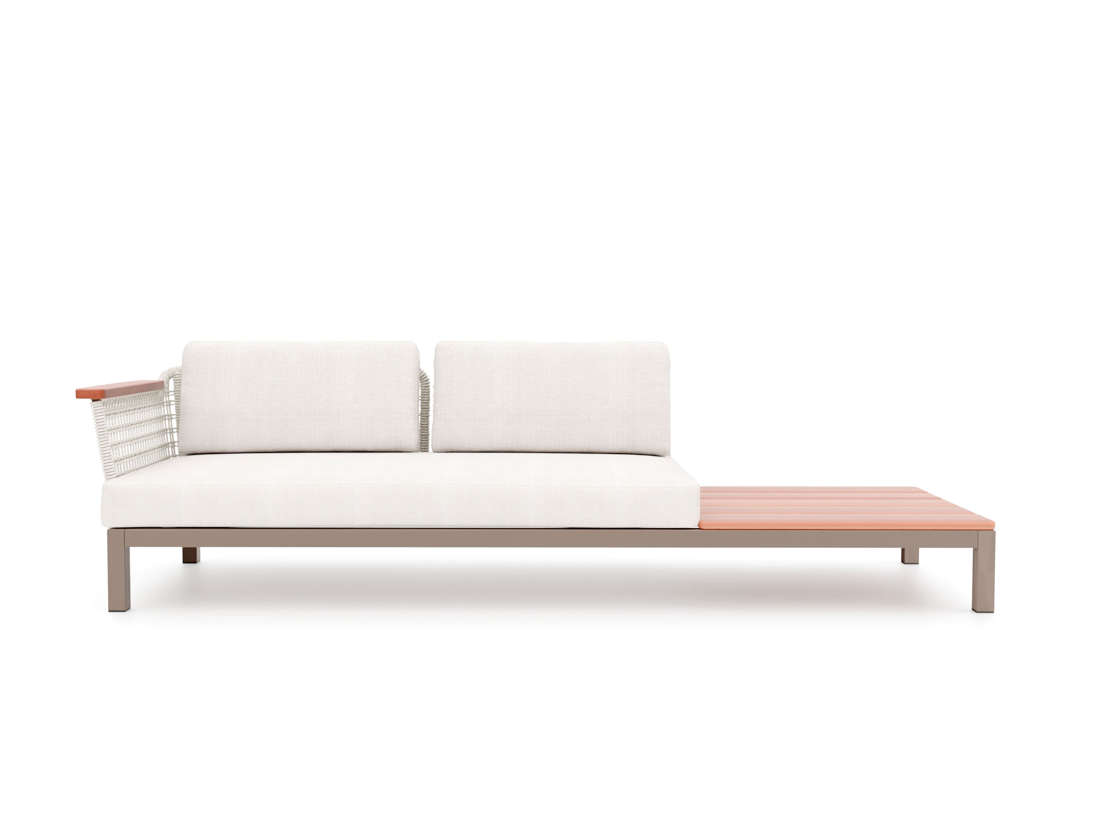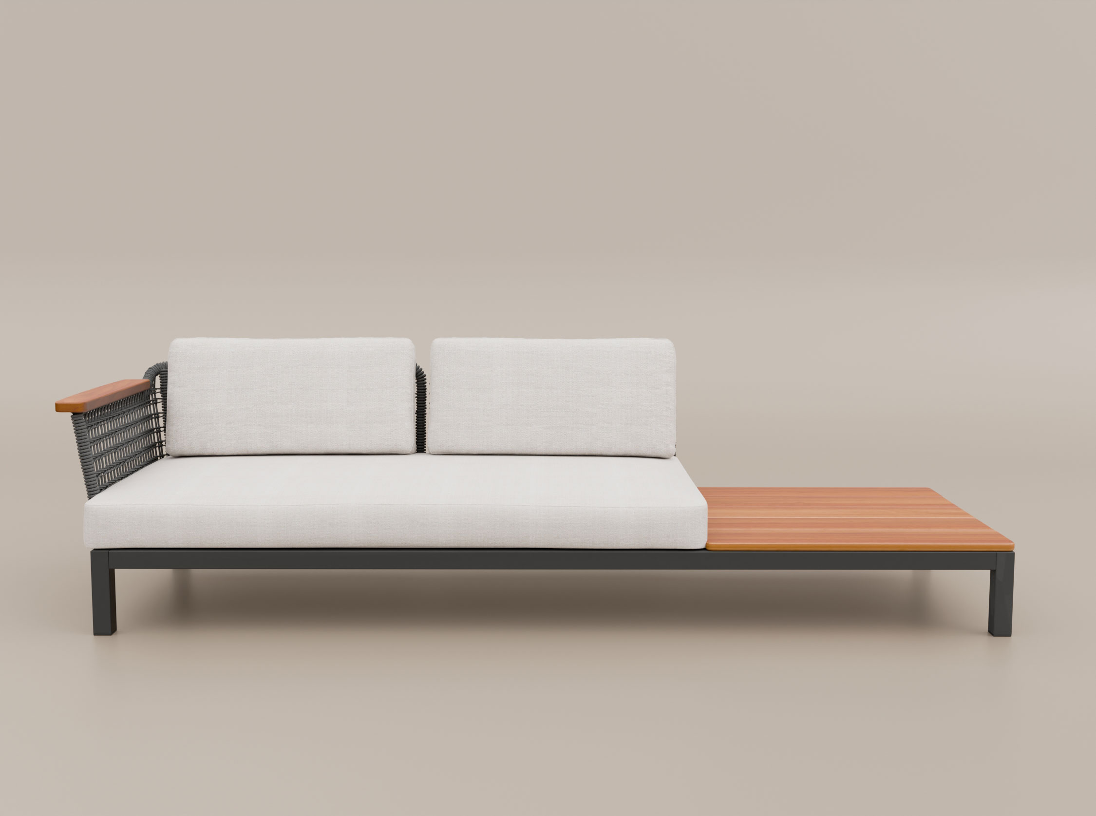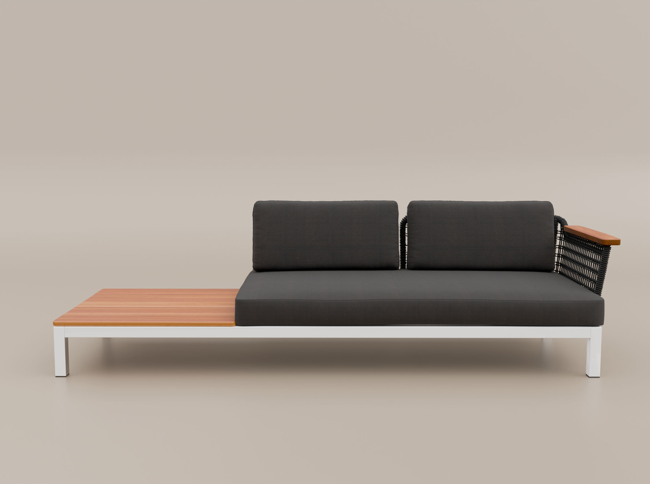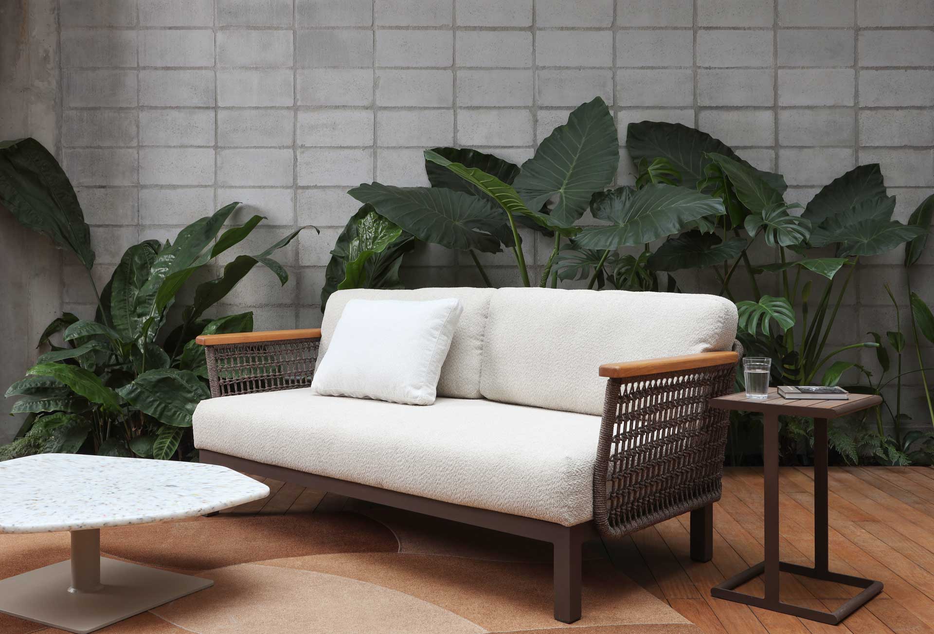 O Sofá Ponte de 2 lugares com mesa lateral combina assento e apoio em um único desenho. Sua estrutura em alumínio e estofados preparados para o uso externo são envolvidos por laterais em macramê e acabamentos em madeira maciça. A mesa lateral pode ser posicionada à esquerda ou à direita, e a peça também pode receber um braço no lado oposto.