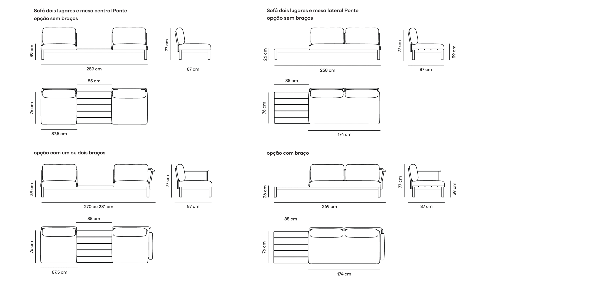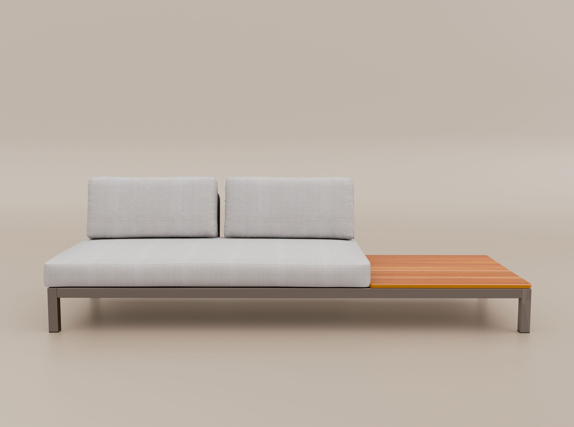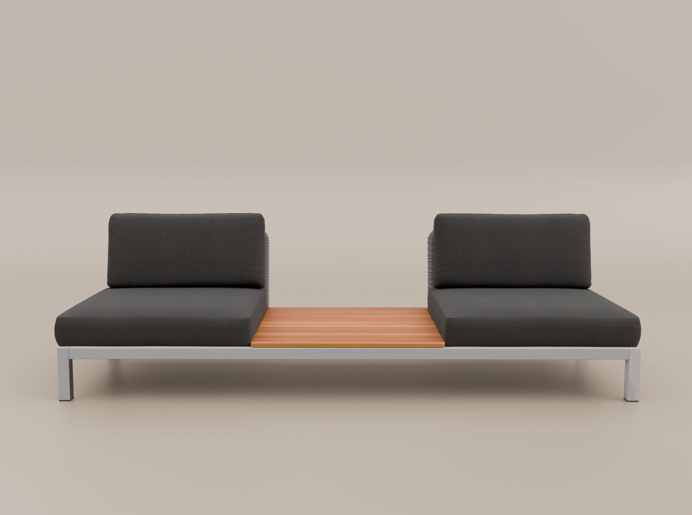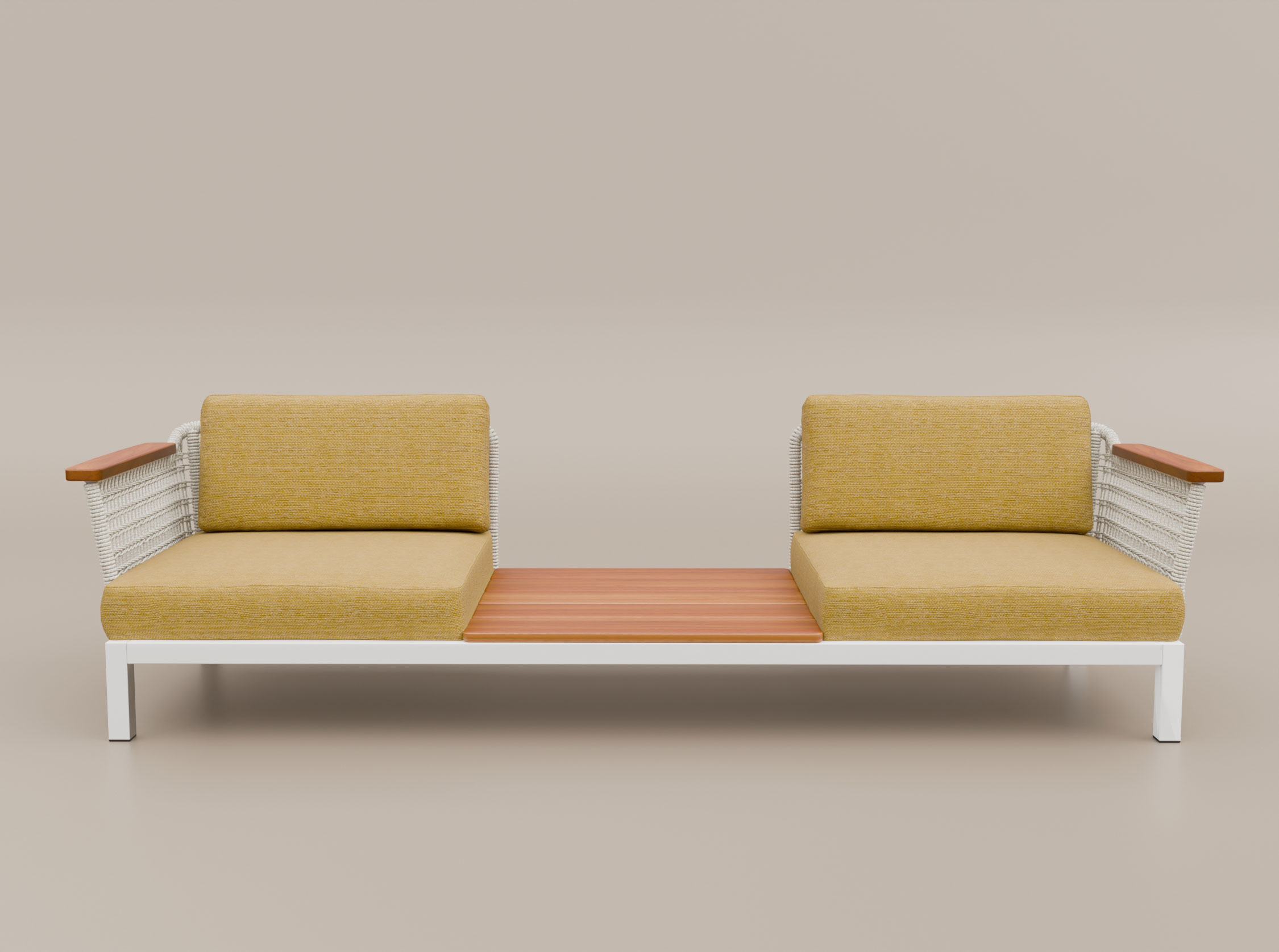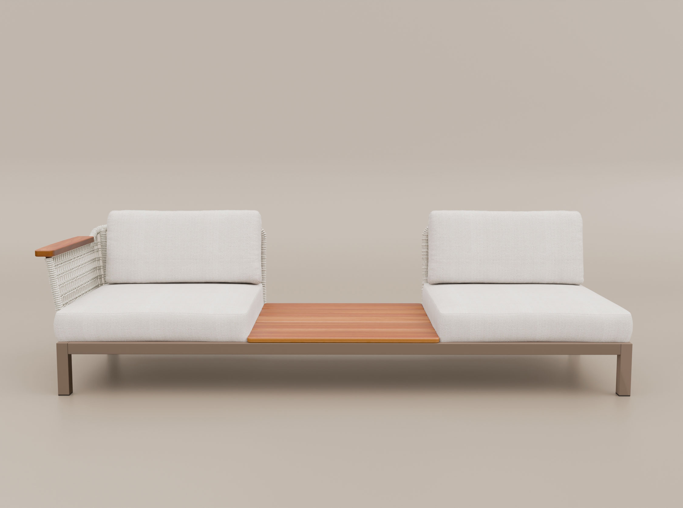 O Sofá Ponte de 2 lugares com mesa lateral combina assento e apoio em um único desenho. Sua estrutura em alumínio e estofados preparados para o uso externo são envolvidos por laterais em macramê e acabamentos em madeira maciça. A mesa lateral pode ser posicionada à esquerda ou à direita, e a peça também pode receber um braço no lado oposto.