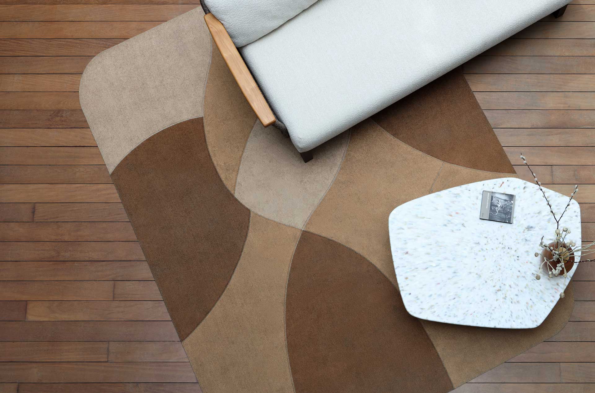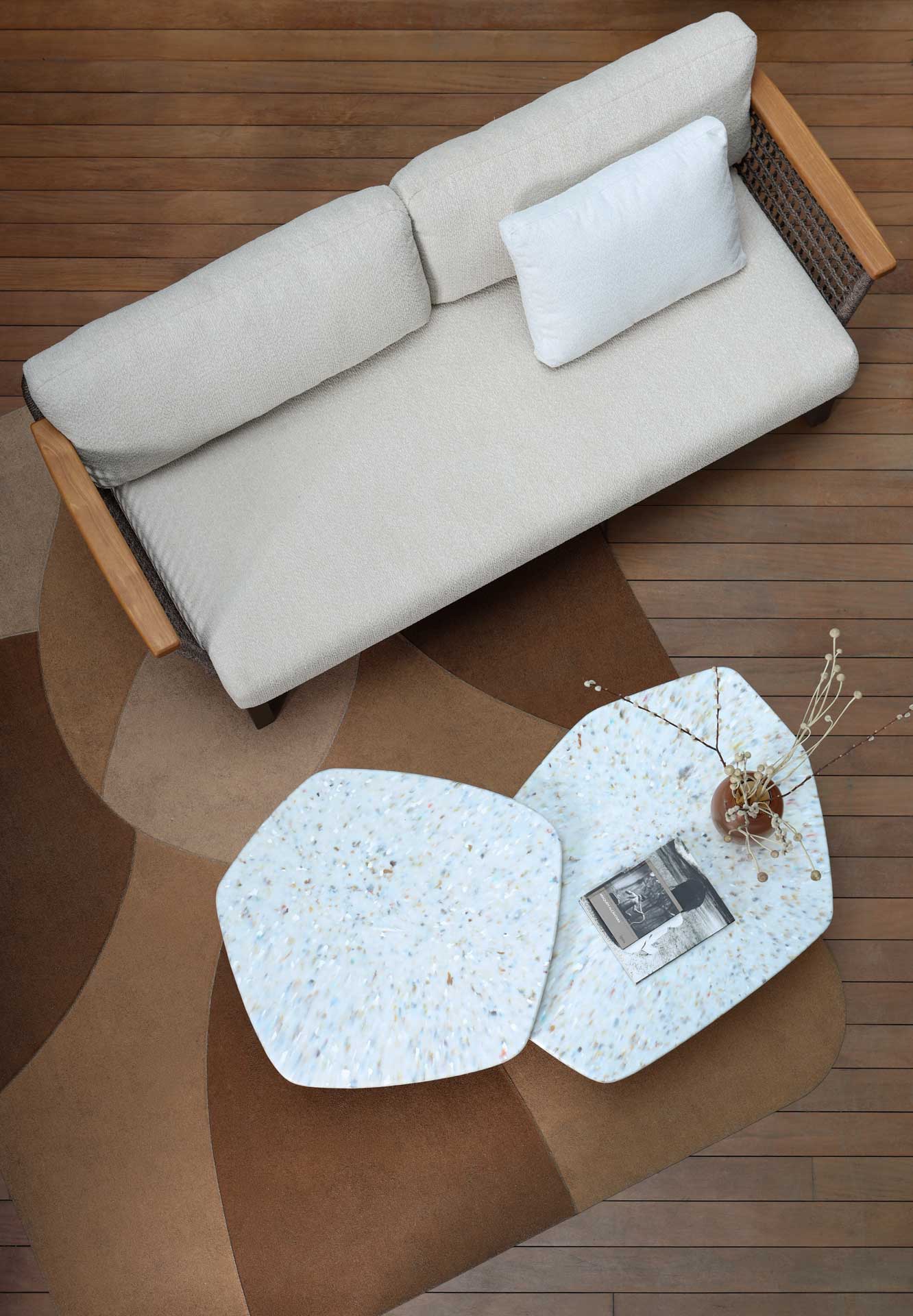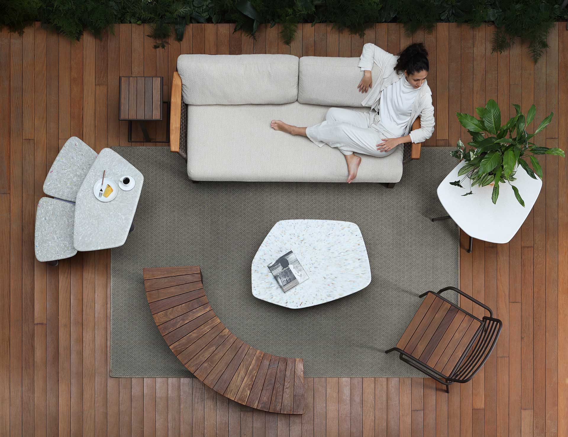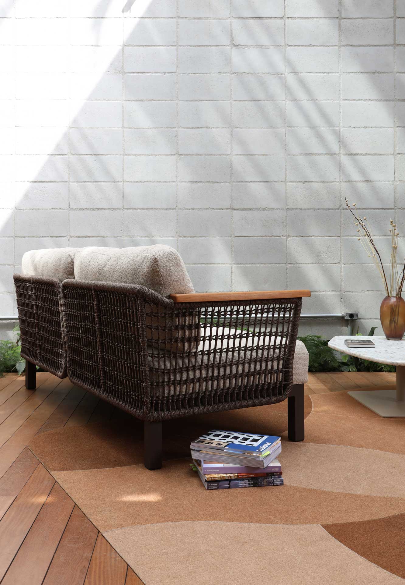Linha de estofados para áreas externas com trançado de macramê com padronagem exclusiva. Disponível em três módulos sendo um módulo central, um módulo canto, com braço disponível à direita ou esquerda e um módulo chaise. A linha combina a expertise técnica da produção industrial com a finalização artesanal do trançado macramê de corda naval.
