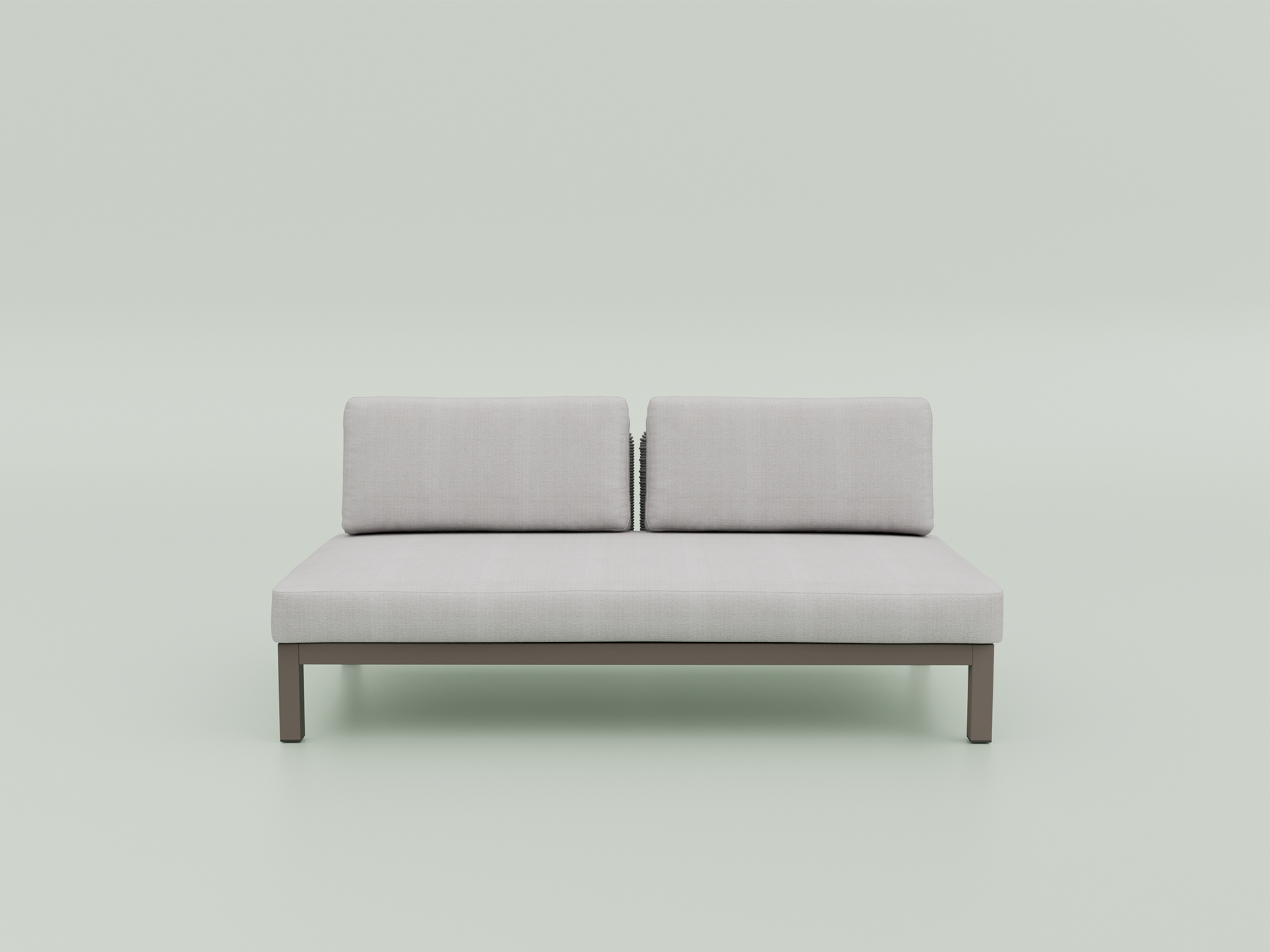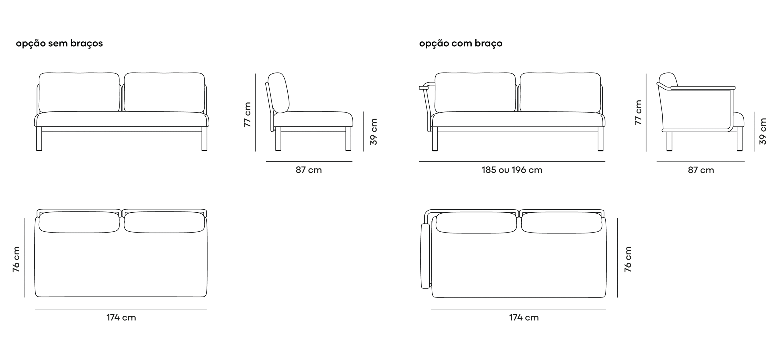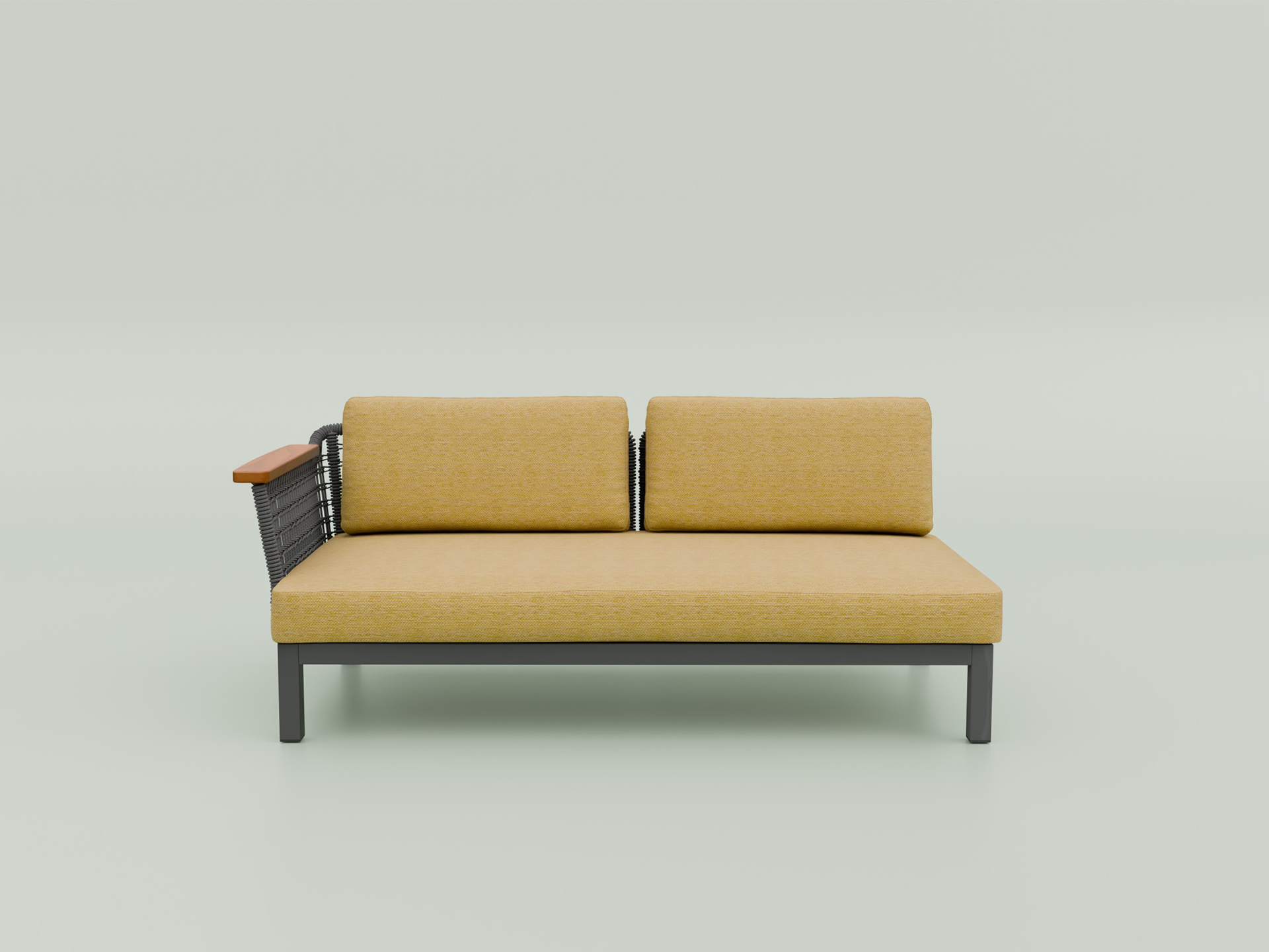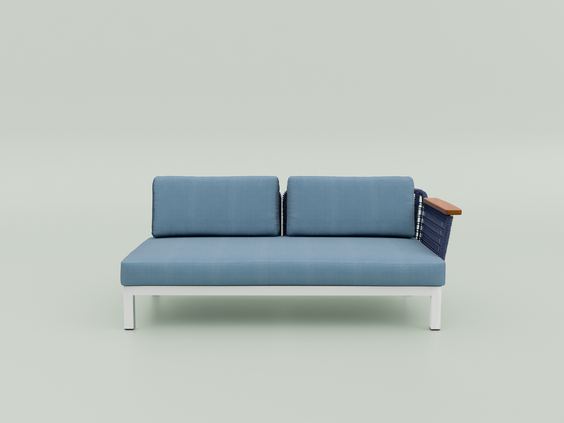 O Sofá Ponte de 2 lugares combina proporção equilibrada e versatilidade para projetos externos. A estrutura em alumínio garante durabilidade, enquanto os assentos estofados oferecem ergonomia e aconchego. O trançado em macramê de corda naval, aliado aos detalhes em madeira maciça, valoriza o aspecto artesanal. Está disponível nas versões sem braço, com um braço — à esquerda ou à direita — ou com dois braços.