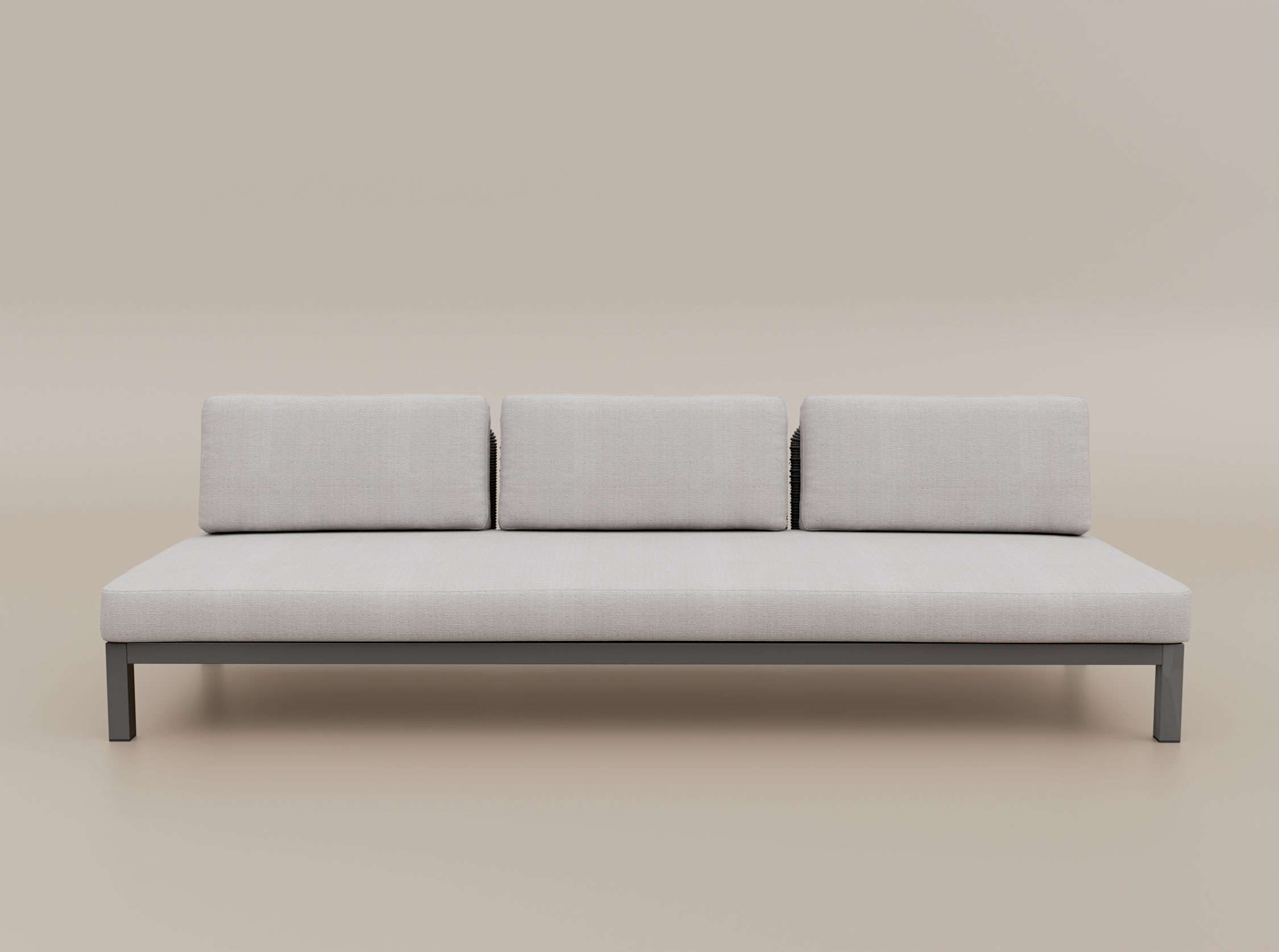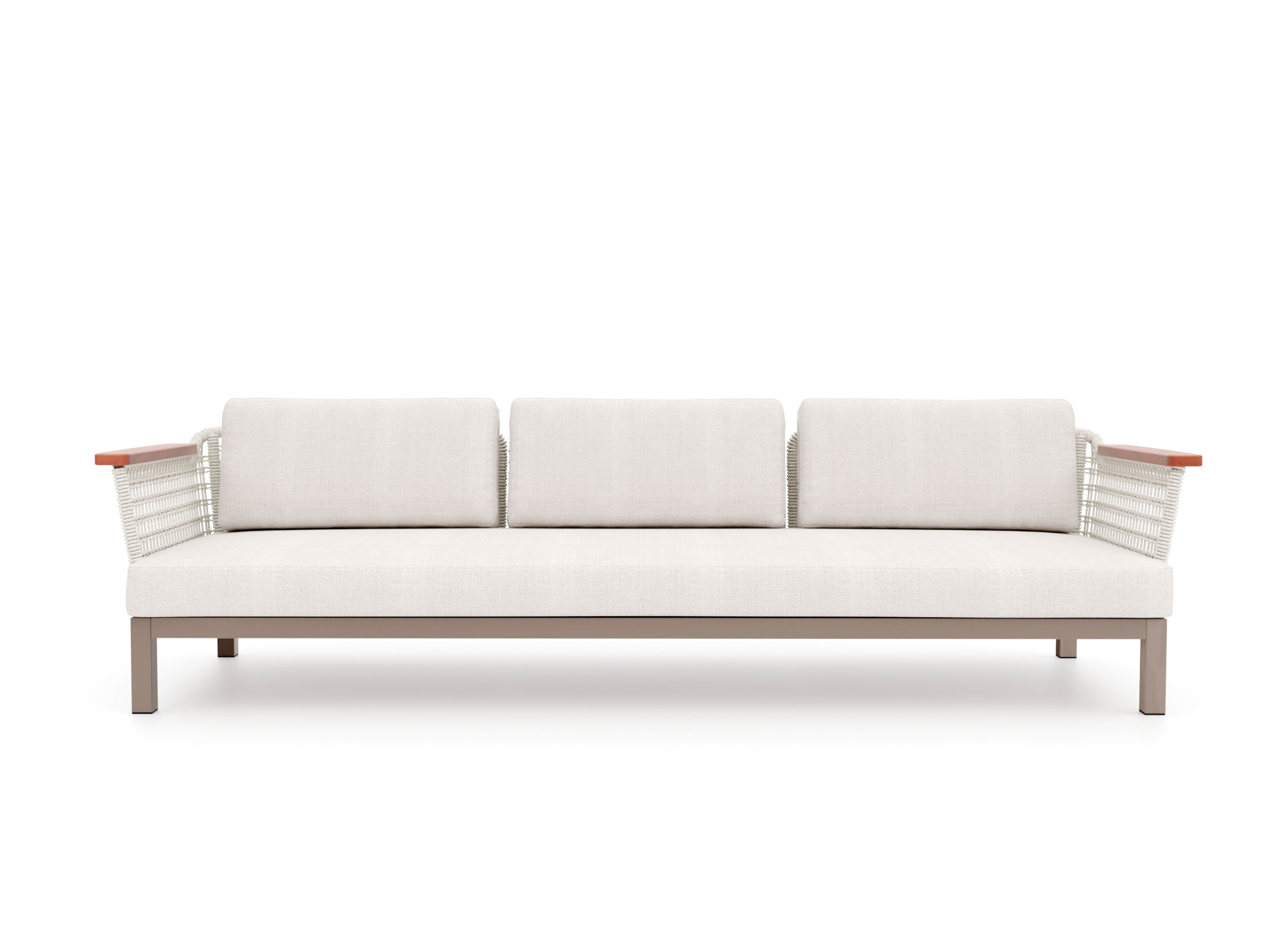Linha de estofados para áreas externas com trançado de macramê com padronagem exclusiva. Disponível em três módulos sendo um módulo central, um módulo canto, com braço disponível à direita ou esquerda e um módulo chaise. A linha combina a expertise técnica da produção industrial com a finalização artesanal do trançado macramê de corda naval.