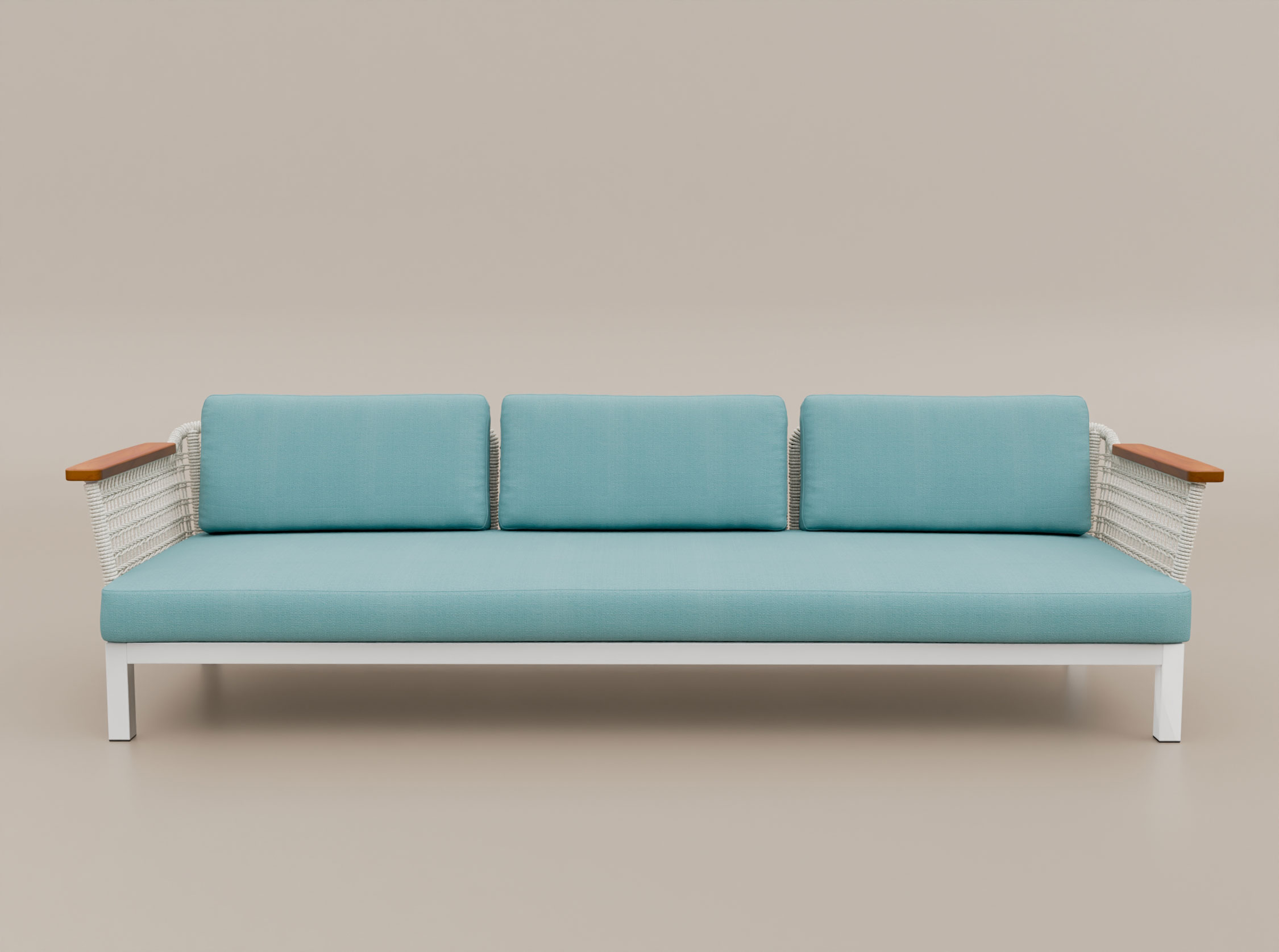 Projetado para composições coletivas, o Sofá três lugares Ponte integra conforto e resistência em áreas externas. Estrutura em alumínio, estofados ergonômicos, trançado em macramê de corda náutica e detalhes em madeira maciça dão forma a uma peça que se conecta à paisagem e acolhe diferentes usos.