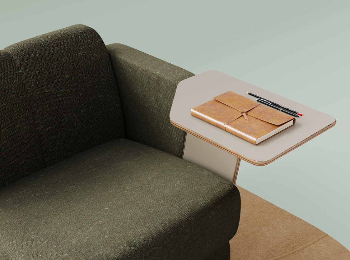 Desenhada para o segmento corporativo, a poltrona Samba com prancheta pode ser usada individualmente como estação de trabalho, ou pode ser usada em composição com outros móveis integrantes da linha. Produzido em estrutura de compensado, com espuma D33 revestida em tecidos variados. Versões opcionais com um braço – à direita ou esquerda – ou dois braços, e tomadas integradas.