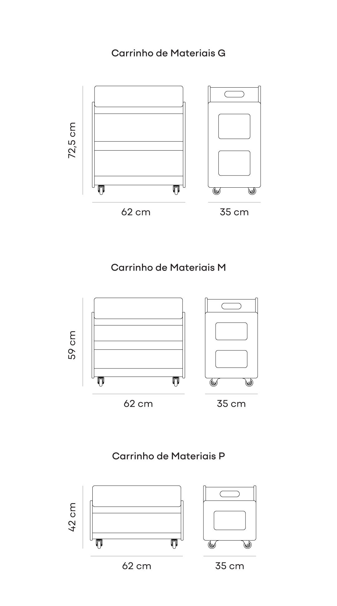 Carrinho para materiais de alta resistência projetados para ambientes escolares de uso intenso. Possui uma caixa organizadora removível. Produzido em compensado de madeira maciça, é leve e pode ser facilmente transportado entre ambientes com seus rodízios. Três tamanhos disponíveis.