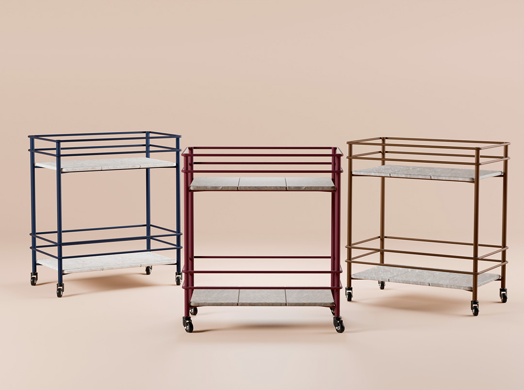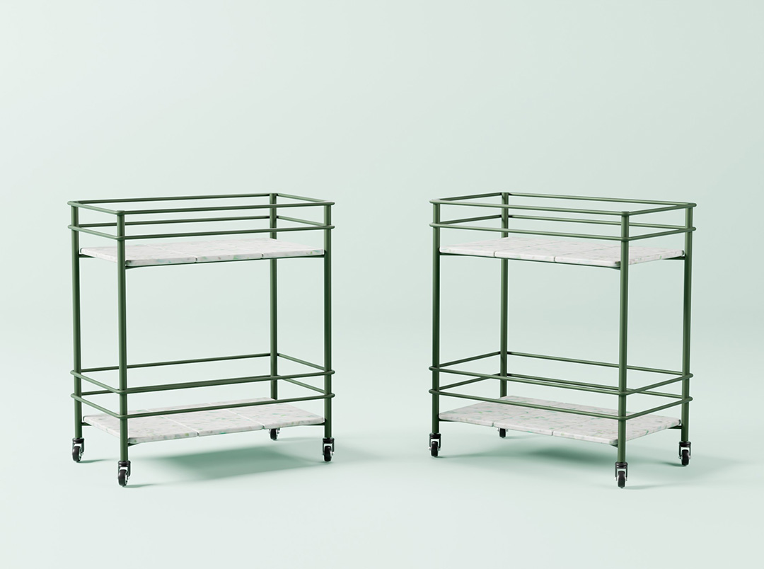 Carrinho de alta resistência para materiais, desenhado para uso em ambientes internos ou externos. Sua estrutura é feita em aço carbono ou aço inox com pintura eletrostática resistente ao clima, as prateleiras com ripas de plástico PEAD reciclado pós-uso.