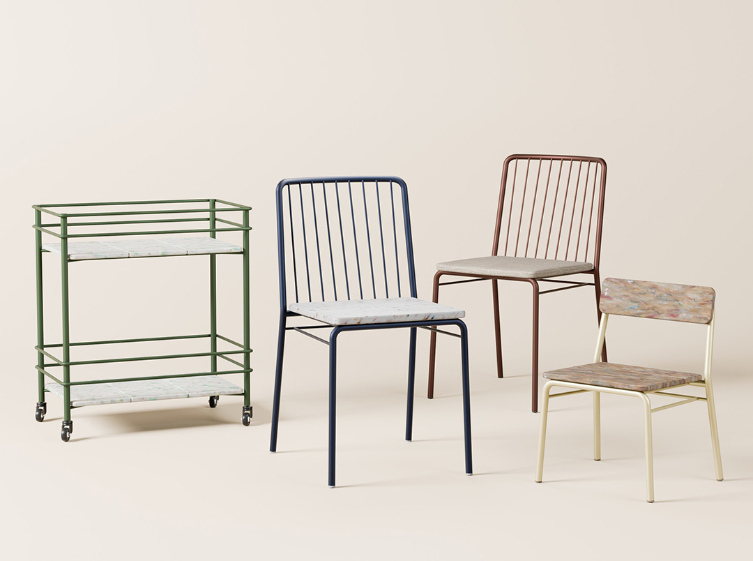 A linha Pipa foi desenhada com linhas sutis que destacam a estrutura e que enquadram as ripas de plástico reciclado pós-uso. Combinando referências clássicas com novas materialidades, essa linha confere um charme único aos espaços.